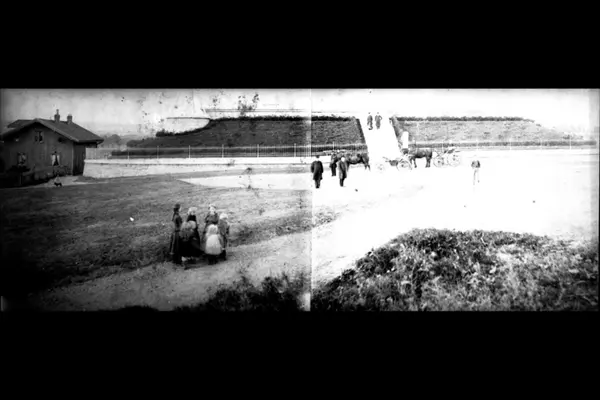 To stk hest og vogn, med pent kledde personer. Søndagsutflukt (?). Murkonstruksjon, inngjerdet, men med trapp opp. Vannbasseng? Gruppe med barn i forgrunnen. Bildet er en montasje av to fotografier. Stadsingeniøren - Fotografier af Kristiania (albumtittel). Ca 1892, basert på øvrige daterte bilder i samme album.