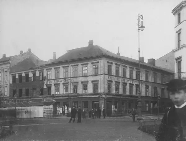 Gatemiljø fra krysset Karl Johans gate - Rosenkrantz' gate (inn til høyre). Gatelykt. Søstrene Larsens Privat-Hotel, Karl Johans gate 33. Se også A-20189/U/002/059. Stadsingeniøren - Fotografier af Kristiania (albumtittel). Ca 1892, basert på øvrige daterte bilder i samme album.