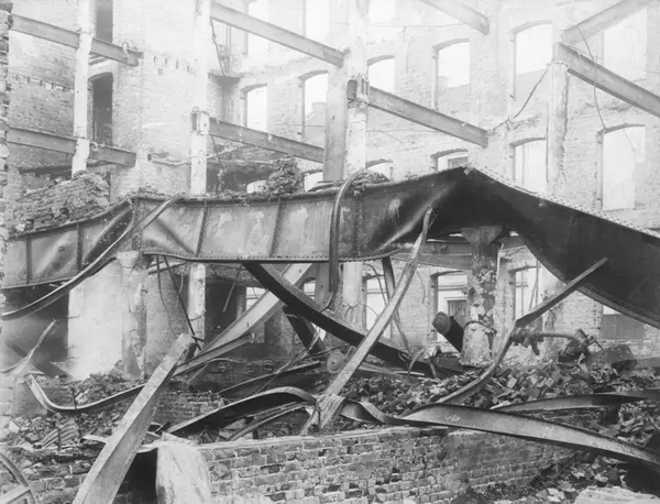 Branntomt - stålbjelker, delvis nedrast bygård. Stadsingeniøren - Fotografier af Kristiania (albumtittel). Ca 1892, basert på øvrige daterte bilder i samme album.