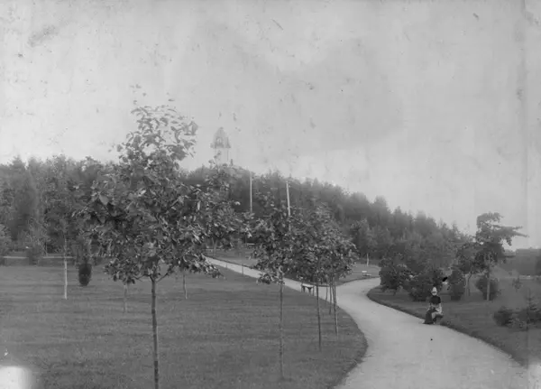 Fra nordenden av parken på St. Hanshaugen. Nyplantete trær, kvinne på benk. Damvokterboligen over trærne i bakgrunnen. Bildet er venstre del av montasje med bilde A-20189/U/002/046b. Stadsingeniøren - Fotografier af Kristiania (albumtittel). Ca 1892, basert på øvrige daterte bilder i samme album.