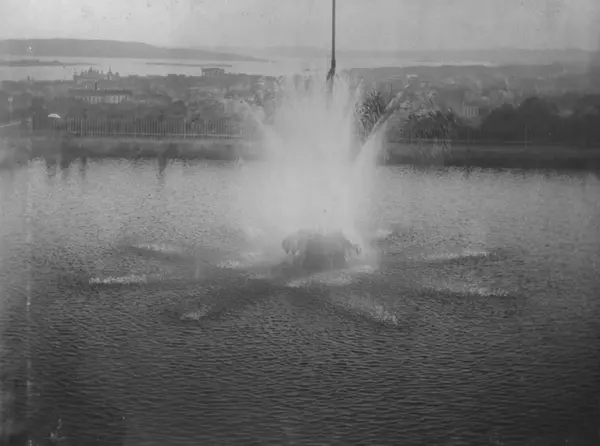Fra vannbassenget på toppen av St. Hanshaugen, med fontenen i midten. Utsikt over byen i bakgrunnen. Stadsingeniøren - Fotografier af Kristiania (albumtittel). Ca 1892, basert på øvrige daterte bilder i samme album.