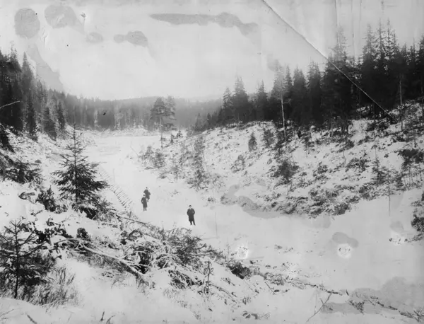 Mann ved en grøft? Tunnelarbeid i Nordmarka (Ørfiskeoverføringen?). Skoglandskap. Stadsingeniøren - Fotografier af Kristiania (albumtittel). Ca 1892, basert på øvrige daterte bilder i samme album.