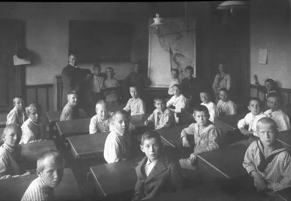 Klasserom med elever og deres lærer. Gutt foran tavlen med kart over Nord- og Sør Amerika. Geografitime. Femte klasse i middelskolen? Skolepulter. Matrosdress. Klassebilde.