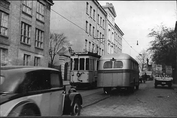 Oslo Sporveier. Trikk motorvogn type SS nr. 111 linje 17, Sinsen - Ullevål Hageby, her i Trondheimsveien ved daværende Sofienberg barneskole. Trafikkmiljø utenfor sett fra motsatt side av gata. Albumtittel: "Sofienberg skole femti år - første september 1933."