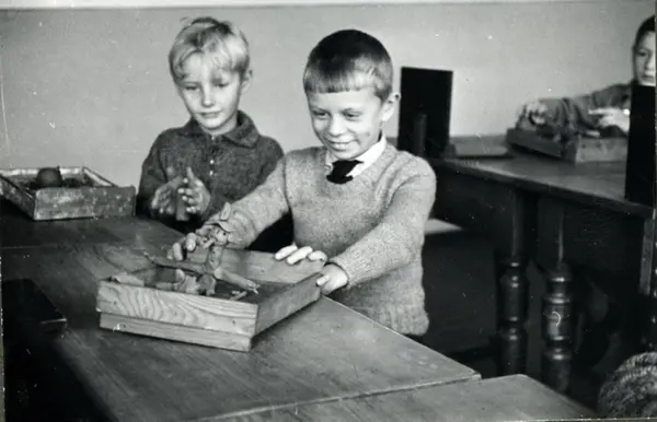 To gutter som viser fram figurer i leirere de har laget. Elevarbeide. (Formingsundervisning). Merk spesiell ortografi i bildets originale tittel. Albumtittel: "Sofienberg skole femti år - første september 1933."