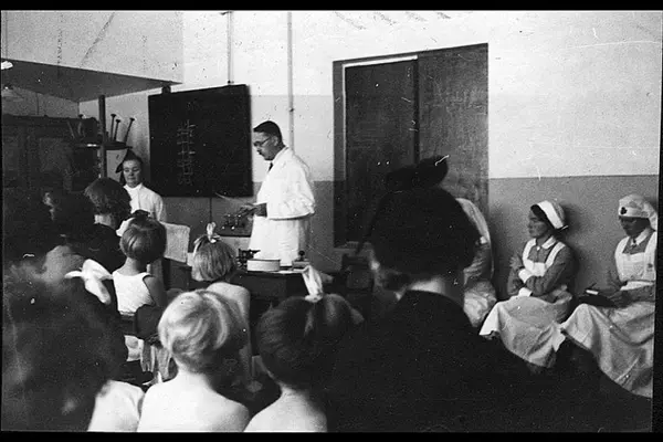 Skolelegen skal undersøke barna. Med helsesøster, sykepleiersker og foreldre tilstede. Albumtittel: "Sofienberg skole femti år - første september 1933."
