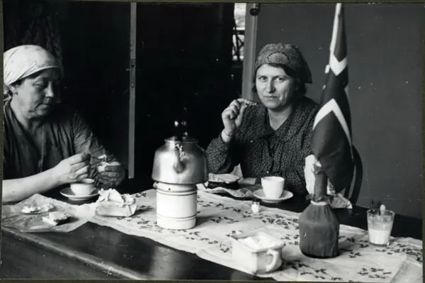 Fra rengjøring før sommerferien. To kvinner spiser matpakker. Legg merke til flagget og kaffekjelen på bordet! Albumtittel: "Sofienberg skole femti år - første september 1933."