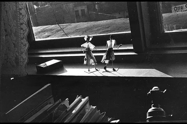 Fra skolens tegnesal. Modeller laget av ståltråd og kreppapir i vinduskarmen. (Formingsundervisning). Albumtittel: "Sofienberg skole femti år - første september 1933."