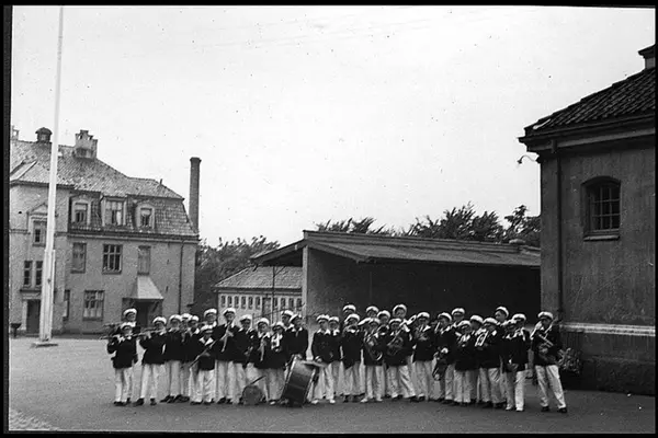 Skolens musikkorps i full uniform øver i skolegården. (Sofienberg skoles Guttemusikkorps) Albumtittel: "Sofienberg skole femti år - første september 1933."