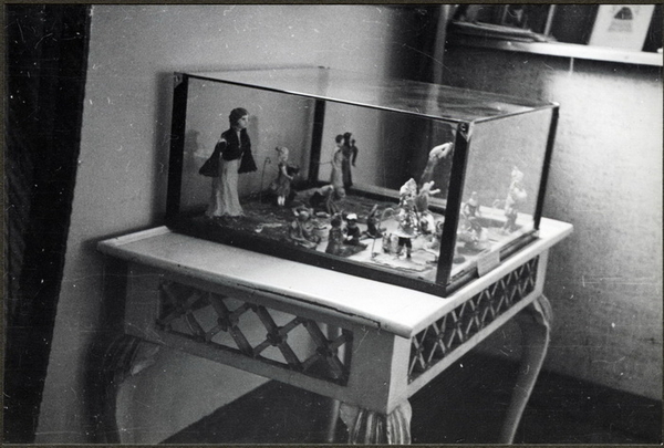 Albumtekst:" I monteren: modelleringsarbeider i pipeler utført av 7 kl piker og framvist på samme utstilling april 1933." (Formingsundervisning). Albumtittel: "Sofienberg skole femti år - første september 1933."
