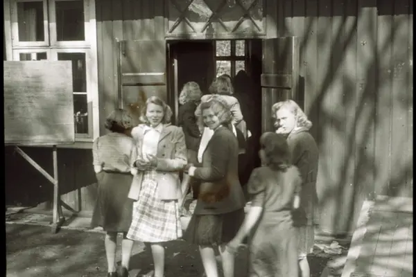 Undervisning i provisoriske lokaler ved Sagene skole under okkupasjonen. Inn etter friminutt. Jenter (fra venstre Randi Fjeld, Eva Nilsen og Marit Johansen) utenfor undervisningslokalet i Biermannsgården i Maridalsveien.