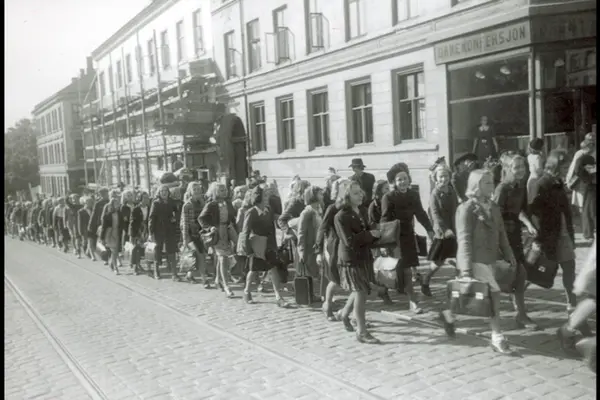 Prosesjon, skolekorps og Sagene skoles fane i forbindelse med første skoledag på "egen" skole etter frigjøringen. På vei til Sagene skole. Elever og lærere med vesker og mapper. Opp Vogts gate på hjørnet ved Marcus Thranes gate (som går inn til høyre ved damekonfeksjonen). Guttekorpset på Sagene med overlærer og rektor i spissen. Bildets originale tittel "Bortover Markus Thranes gate" er feil. Jf. A-40066/Ua/0003/001 og A-40066/Ua/0003/002.