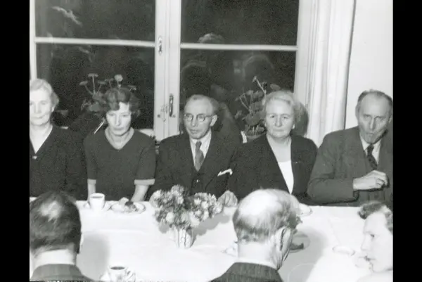 Katrine Arnesen, overlæreren på Sagene skole (2 fra høyre) med inspektøren dr. Ribsskog og skolestyrets formann hr. Olaf Solumsmoen. Lengst til venstre overlærer Else Skjærstad med Wera Gerhardsen (?).