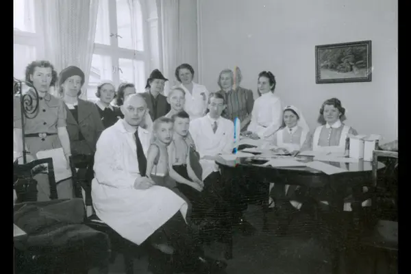 Oslo menighetspleiers fellesutvalg formidlet innbydelser og organiserte barnereiser under okkupasjonen. Barna fikk komme på landet "å fete seg opp". De ble sendt til bygder rundt i hele Sør-Norge. Dette bildet er tatt under legeundersøkelsen vinteren 1943 der barna ble veid og vurdert. I forgrunnen i hvit jakke sekretær Einar Smith med noen tynne gutter. Dessuten barnelege Ek til høyre for guttene. Bak fra venstre: Fellesutvalgets hjelpearbeidere: Eva Andresen, G. Collett, I. Fearnley, S. Titlestad, Marit Bonnevie Svendsen og Grethe Lundgård.