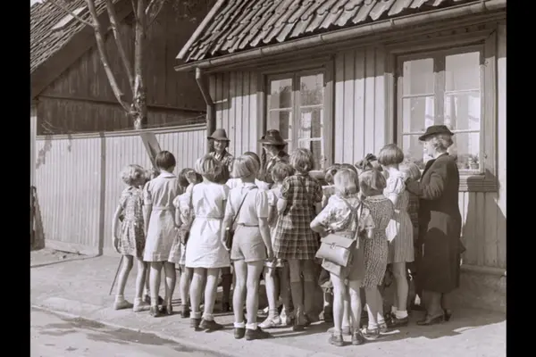 På vei til Biermannsgården, et av lokalene som ble brukt som provisorisk klasserom ved Sagene skole under okkupasjonen. Lengst til høyre overlærer Katrine Arnesen