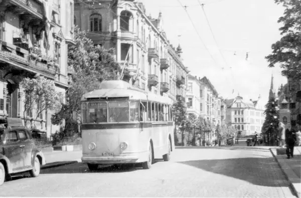 Oslo Sporveier, A-15704, liten NEBB, linje 21. Nils Juels gate. Bussen har akkurat passert Bygdøy allé og er på vei ned mot Skillebekk. I bakgrunnen Frogner skole. Bildets originalwe tittel "Buss i Skovveien" er feil.
