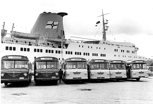 To Oslo Sporvei busser og fire busser fra Trondheim sporvei, Kielferja i bakgrunnen. Oslo Sporveisbussene har doble inngangsdører foran som tilssier at de ble levert med hel-automatiske girkasser. Det antyder på at bildet er fra 1970.