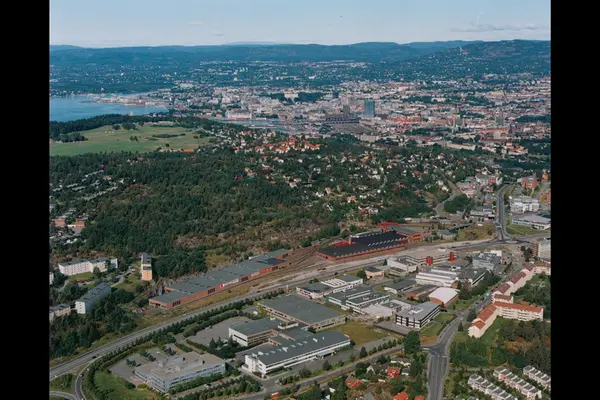 Enebakkveien, Europaveien (E 6), Vårveien. Ryen industriområde. Vognhall / verksted for T-banen. Simensbråten og Ekebergsletta nærmest i bakgrunnen. (Flyfoto)