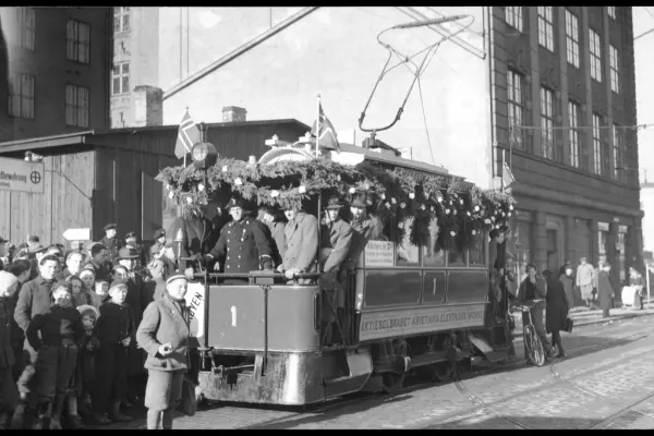Blåtrikkens, Kristiania Elektriske Sporveiers vogn på Jernbanetorget pyntet med flagg og granbar-ranker. Fra Sporveiens jubileum for 50 år med elektrisk drift i 1944.