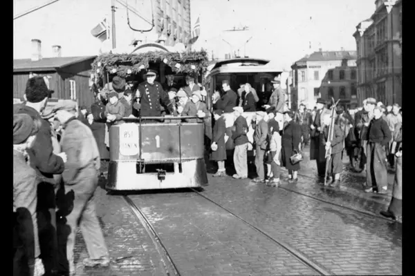 Kristiania Elektriske Sporveiers vogn 1 pyntet med flagg og granbar-ranker. Masse publikum, skolebarn, skiløper. Fra Sporveiens jubileum i 1944 for 50 år med elektrisk drift. Østbanehallen i høyre bildekant.