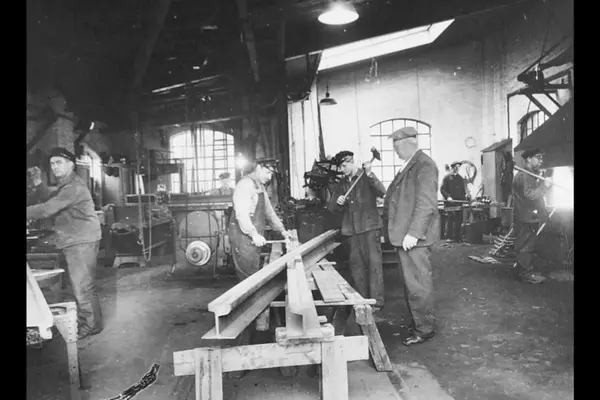 Interiør, arbeidere i Sagene vognhall. Aksel Magnus Kjensli ved skinnekrysset i lys skjorte og overall. Mannen til høyre i dress er formannen Røssholt.