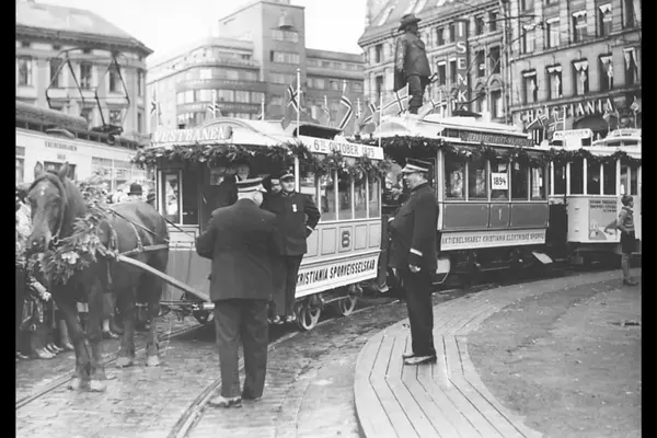 Fra venstre: Hestesporvogn, Kristiania Elektriske Sporveiers vogn nr. 1 og Oslo Sporveiers vogn nr 133 i trikkesløyfa på Stortorvet. 6. oktober 1935, fra 60-års jubileumet for den første sporvogn i Kristiania, jf. A-40202/Uaa/0002/044