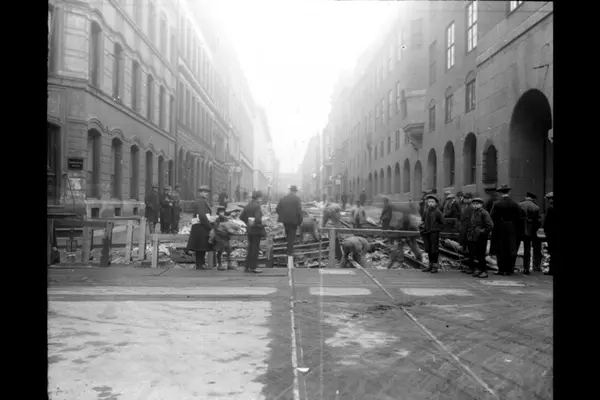 Arbeid på skinnene for å anlegge en svingmulighet opp Prinsens gate slik at det ble mulig å kjøre gjennomgående vogner fra Storgata til Stortingsgata via Dronningens gate.