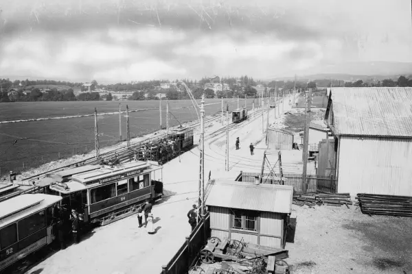 Kristiania Elektriske Sporveiers trikk på vei ut av vognhallen til høyre, bak står en liten Holmenkollbanevogn klar til avgang med fullastet åpen tilhenger. Treskuret ved siden av til høyre fungerte i en periode som stasjonsbygning for Holmekollbanen