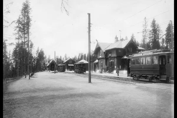 Holmenkollen stasjon var endestasjon på Holmenkollbanen fra 1898 frem til banens forlengelse med Tryvannsbannen i 1916. Da endret stasjonen navn til Besserud stasjon. Samtidig ble godshuset flyttet til Lillevann stasjon, hvor det ble benyttet som stasjonsbygning. Vi ser sporvognene 6, 20 og 17. Sporvogn 17 står i hallen. Se også A-40203/Uaa/0002/040.