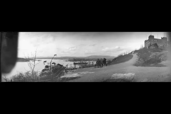 Utsikt over fjorden og havneområdet. Hovedøya til høyre, Vippetangen sees midt i bildet, Sjømannsskolen til høyre, benk med tre menn som skuer utover Oslofjorden.