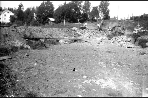 Arbeidet med forlengelsen av Lilleakerbanen til Bekkestua og Haslum. Arbeidere jobber på traséen. Bildet er tatt 19. juni 1922. Forlengelsen stod ferdig 1924.