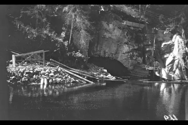Inngangen til tunnelen som ble sprengt for å lede Lysakerelva gjennom fjellet på Bærumssiden. Etter at vannet ble ledet gjennom tunnelen begynte anlegget av fylling på tvers av elveleiet. Fra arbeidet med forlengelsen av Lilleakerbanen til Bekkestua. Forlengelsen stod ferdig i 1924.
