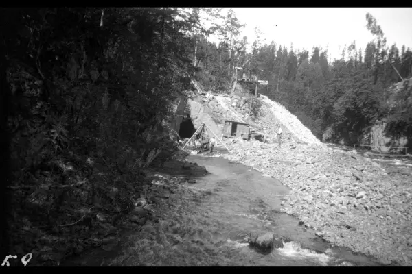 Ved Lysakerelva, arbeid med fylling. Fra tunnelen som ble anlagt for å lede Lysakerelva gjennom fjellet på Bærumssiden for å tillate anlegg av fylling på tvers av elveleiet. Fra arbeidet med forlengelsen av Lilleakerbanen til Bekkestua og Haslum, ferdig 1924.