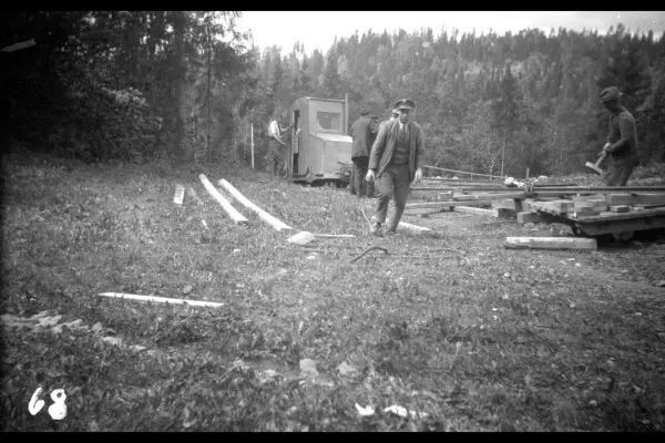 Arbeidere med smalsporet anleggslokomotiv med forbrenningsmotor - se A-40208/Uab/0003/065 og A-40208/Uab/0003/070. Sannsynligvis fra Tjernsrud.Fra arbeidet med forlengelsen av Lilleakerbanen til Bekkestua og Haslum, ferdig 1924.