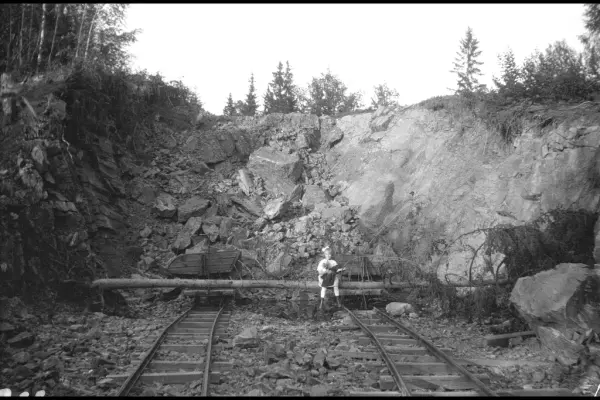 Bildet er tatt under arbeidet med forlengelsen av Lilleakerbanen til Bekkestua og Haslum. En liten jente sitter på en veltet trestokk på det uferdige traséen. Forlengelsen stod ferdig 1924.