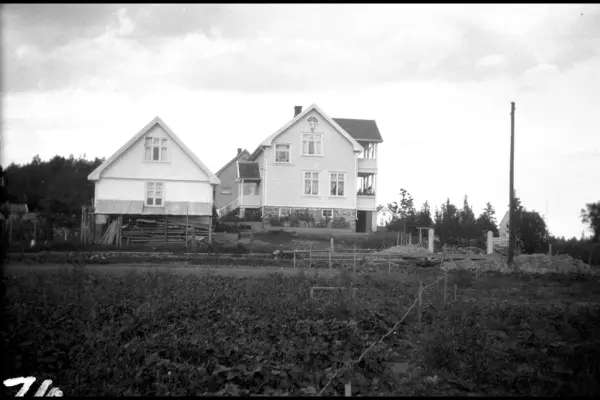 Bildet er tatt under arbeidet med forlengelsen av Lilleakerbanen til Bekkestua og Haslum. Villabebyggelse langs traséen. Forlengelsen stod ferdig 1924. Bildet er tatt 11.08.1922