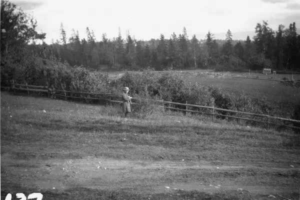 Bildet er tatt under arbeidet med forlengelsen av Lilleakerbanen til Bekkestua og Haslum. Forlengelsen stod ferdig 1924. I bakgrunnen sees traséen, 29.09.1922