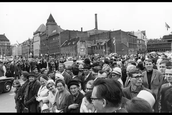 Åpning av Lambertseterbanen, 22. mai 1966. Folkemengde på Jernbanetorget. Basarene i Kirkeristen til høyre. Til venstre krysset Fred Olsens gate - Karl Johans gate mot Jernbanetorget.