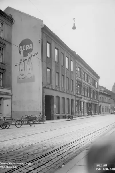 Vognmansgata med Jernbanetorget i bakgrunn. Vognmannsgata. 6, 8 og 12. Reklame på gavlvegg - NORA mineralvann. Parkerte sykler på brolagt gate. Området sanert på 1960-tallet under utbyggingen av Tunnelbanen.