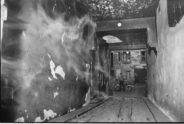 Utsikt gjennom portrommet mot gata. Bildetekst fra boken Oslo-bilder s. 112 -113. : "Eksosen driver inn fra trafikken i Grønlandsleiret. I alt 14 husstander har sin daglige gang gjennom denne porten." Fotografiet er fra prosjektet og boka ''Oslo-bilder. En fotografisk dokumentasjon av bo og leveforhold i 1981 - 82''. Kontakt Samfoto/Scanpix ved ev. bestilling av kopier.