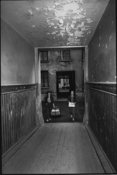 To jenter på vei inn i et portrom. Fotografiet er fra prosjektet og boka ''Oslo-bilder. En fotografisk dokumentasjon av bo og leveforhold i 1981 - 82''. Kontakt Samfoto/Scanpix ved ev. bestilling av kopier.
