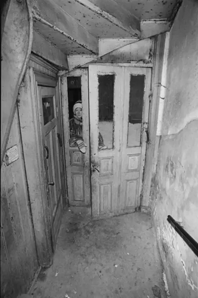 Kvinne utenfor ramponert inngangsdør. Fotografiet er fra prosjektet og boka ''Oslo-bilder. En fotografisk dokumentasjon av bo og leveforhold i 1981 - 82''. Kontakt Samfoto ved ev. bestilling av kopier.