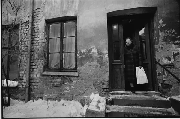 Eldre dame som står i inngangsdøra i bakgården med en bærepose i armen. Fotografiet er fra prosjektet og boka ''Oslo-bilder. En fotografisk dokumentasjon av bo og leveforhold i 1981 - 82''. Kontakt Samfoto ved ev. bestilling av kopier.