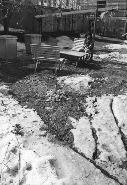 Bakgård med hagemøbler. Vinter. Fotografiet er fra prosjektet og boka ''Oslo-bilder. En fotografisk dokumentasjon av bo og leveforhold i 1981 - 82''. Kontakt Samfoto ved ev. bestilling av kopier.