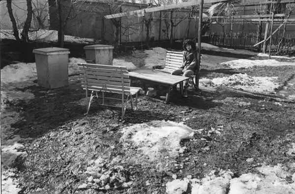 Bakgård med hagemøbler og beboer. Vinter. Fotografiet er fra prosjektet og boka ''Oslo-bilder. En fotografisk dokumentasjon av bo og leveforhold i 1981 - 82''. Kontakt Samfoto ved ev. bestilling av kopier.