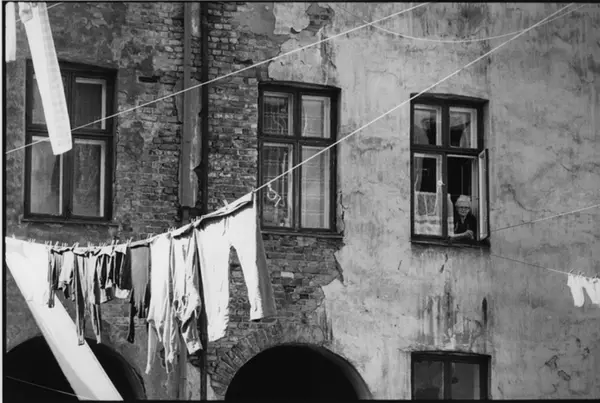 Klesvask til tørk i bakgården. Kvinne ser ut av vinduet. Fotografiet er fra prosjektet og boka ''Oslo-bilder. En fotografisk dokumentasjon av bo og leveforhold i 1981 - 82''. Kontakt Samfoto ved ev. bestilling av kopier.