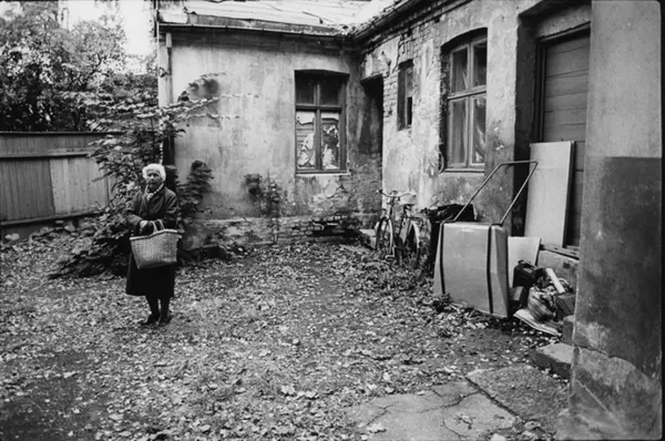 Gammel kvinne med handlebag i bakgård. Fotografiet er fra prosjektet og boka ''Oslo-bilder. En fotografisk dokumentasjon av bo og leveforhold i 1981 - 82''. Kontakt Samfoto ved ev. bestilling av kopier.