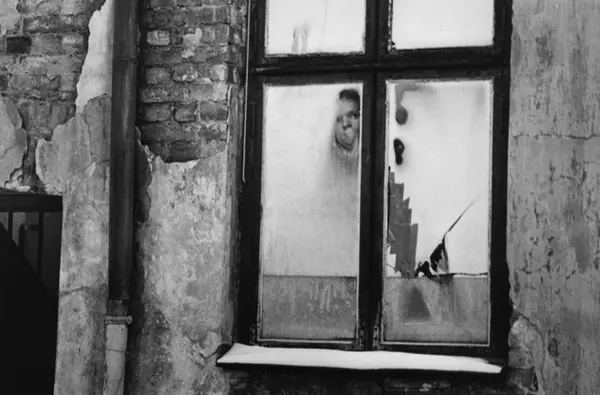 Mann i vinduet mot bakgård. Vinter. Bildet er publisert på s. 44 - 45 i boken Oslo-bilder. Undersøkelsen " Kald Vinter." Det er et lite kikkhull gjennom frosten på ruta, et knust vindu er tapet igjen. Fotografiet er fra prosjektet og boka ''Oslo-bilder. En fotografisk dokumentasjon av bo og leveforhold i 1981 - 82''. Kontakt Samfoto ved ev. bestilling av kopier.