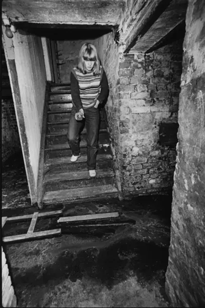Kvinne i kjellertrappa på Olaf Ryes plass 6. Forfallen bygård. Fotografiet er fra prosjektet og boka ''Oslo-bilder. En fotografisk dokumentasjon av bo og leveforhold i 1981 - 82''. Kontakt Samfoto ved ev. bestilling av kopier.