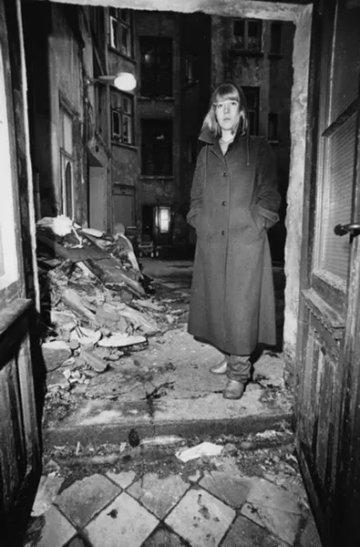 Kvinne utenfor døra mot en forslummet bakgård. Fotografiet er fra prosjektet og boka ''Oslo-bilder. En fotografisk dokumentasjon av bo og leveforhold i 1981 - 82''. Kontakt Samfoto ved ev. bestilling av kopier.